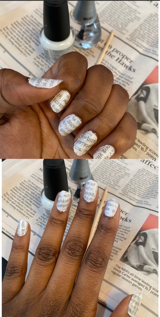 Hey y’all! I love to do my nails and I decided to do some newspaper nail art at home. To achieve this look you’ll need the following items: