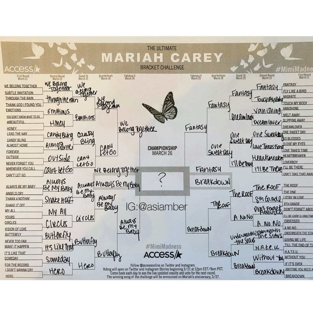 I finished The Mariah Carey Bracket. I didn’t create this game. I just found it on social media and filled it out. As a 90’s baby I love Mariah Carey’s music🦋. I found this bracket’s song selections ranged from Mariah’s ballads to her more uptempo songs. I couldn’t narrow it down to just one song because I have so many favorites. Mariah Carey has been singing songs for 30 years and is a talented writer. This bracket game is similar to the NCAA March Madness Basketball Tournament bracket instead of teams it’s songs. Out of the categories given you pick the song out of the two that you like more and that song advances to another round with other songs. Kind of like 2 basketball teams play a game and the winner moves on to the next level game and competes with other teams. It’s fun! Let’s play! Click the link below to listen to my Mariah Carey playlist on Spotify and click here to listen to it on Apple Music.